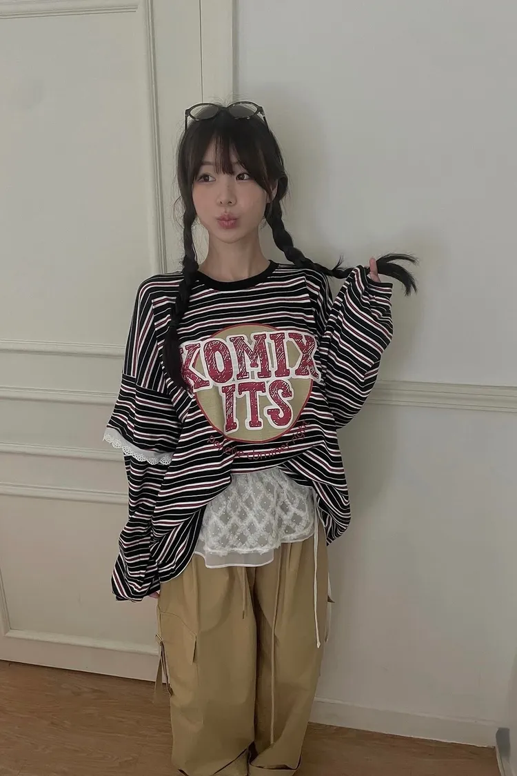 AB1013 米妮家-條紋插畫KOMIX圓圈拼蕾絲接袖T.4色