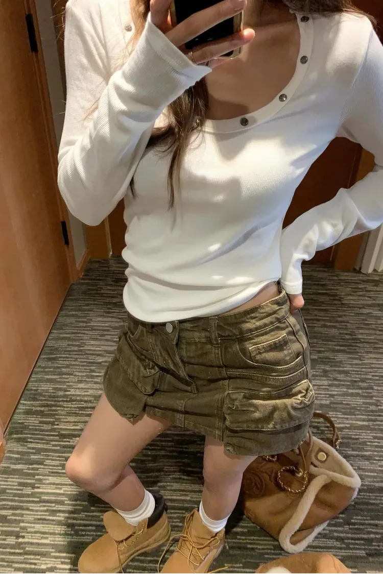 AC1008 流量密碼-大U領滾克羅辛鉚釘螺紋棉順腰上衣.3色