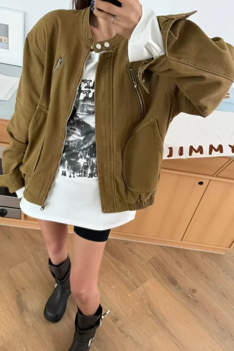 AD1002 啾咪家-洗舊感!無領釘釦卡其布夾克外套.3色