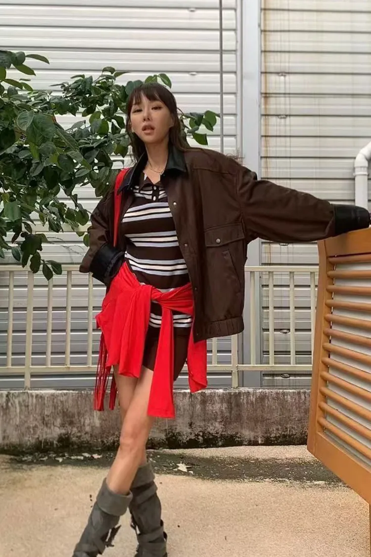 AD1008 啾咪家-皮革領+袖 蓋袋造型 麂皮外套.2色