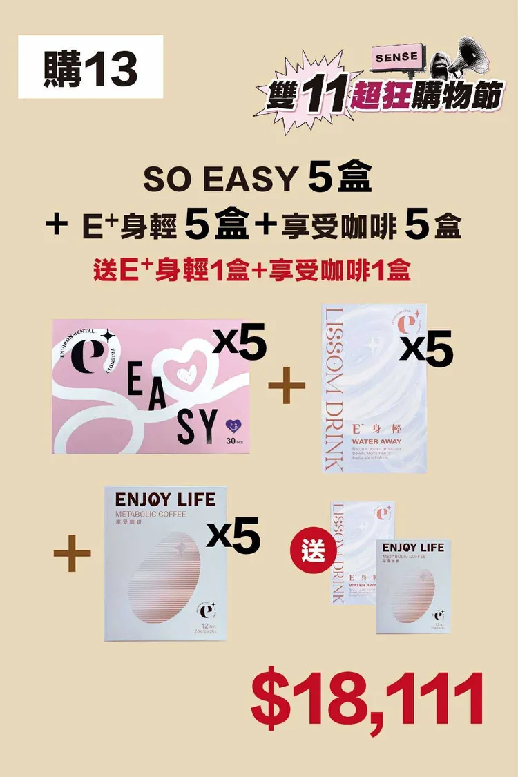 :組合內容: SoSo*5盒+E身輕*5盒+享受咖啡*5盒 :贈品: E身輕*1盒+享受咖啡*1盒 --- E+(一)身輕 15包/盒 清除體內負擔找回纖氣外表 「好好愛自己」從內在開始保養 養出健康與美麗食用方式: 一天一包 / 餐後食用 \ SO EASY 太簡單(一盒30小包) / 美麗輕盈 太簡單 「一杯享受咖啡,開啟你24小時的代謝節奏」 一包20g . 12包/盒 喝對咖啡,代謝才會動! 每天喝咖啡,還是代謝差、常常水腫、嘴饞難控制? 這杯不是一般咖啡,是有在努力幫你「動起來」的代謝咖啡 結合非洲芒果籽綠咖啡、EGCG、益生菌 提神也提效,燃燒也補菌 適合代謝慢、排便不順、想瘦卻總是卡關的你!一杯搞定!飽足感UP|燃燒力UP|排便順|精神清 ㄒ