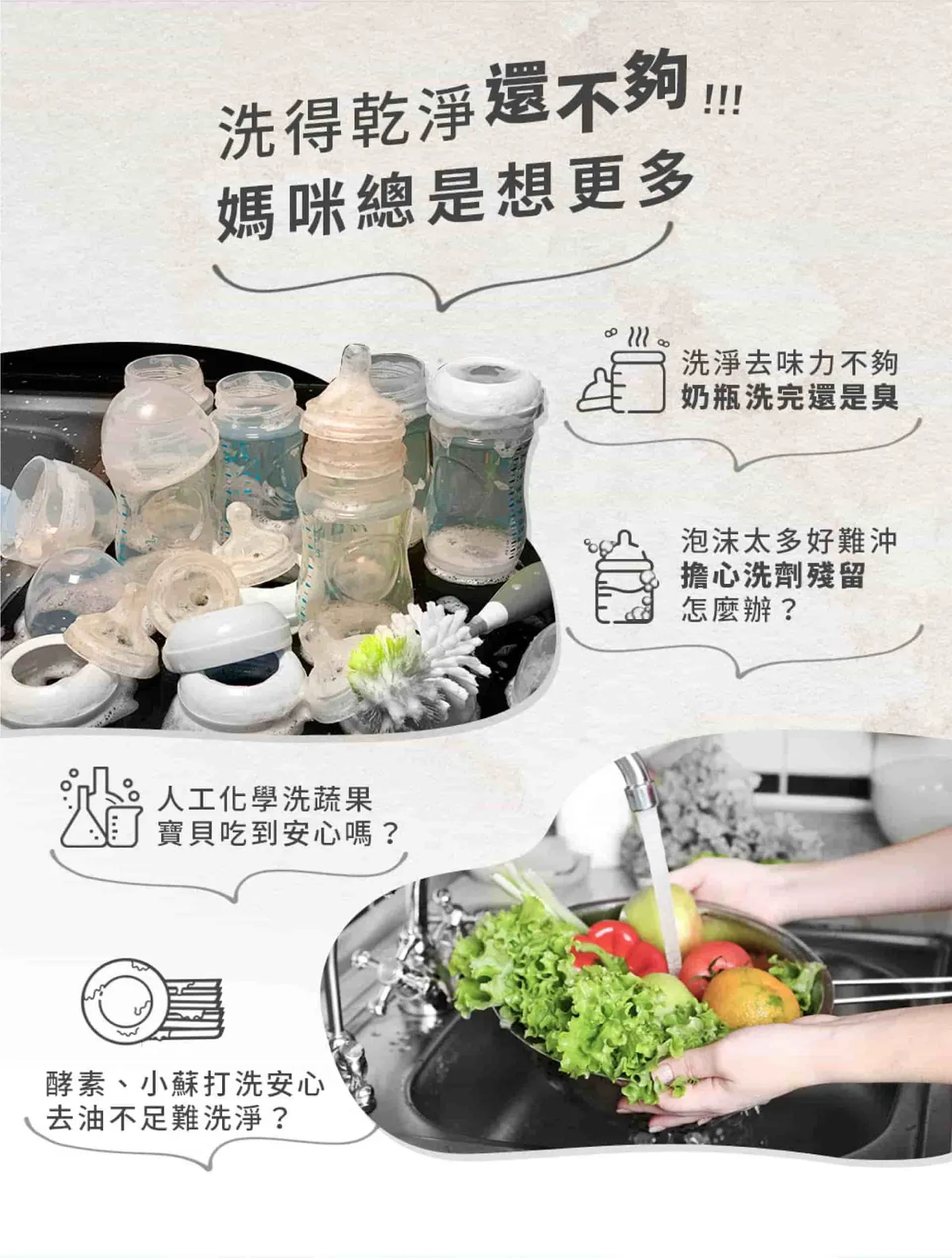 [商品特色] 淨淨奶瓶蔬果清潔劑採用 3 合 1 植物液態皂配方、不含香料、防腐劑,有效清除奶垢、洗淨蔬果殘留農藥,好沖不殘留、溫和不咬手,媽媽洗奶瓶的最佳選擇!『食器清潔皂』通過SGS檢測,不含香精料、精油等成分~使用清潔後,寶寶、寵物都能安心接觸💗 [銷售重點] 媽咪好幫手,可清潔嬰兒奶瓶、餐盤、蔬菜、水果棕櫚油+椰子油+小蘇打,3 合 1 植物液態皂有效瓦解奶垢、油污,乾淨無異味溫和不乾手,超好沖不殘留不含香精料、石化防腐,可生物分解
