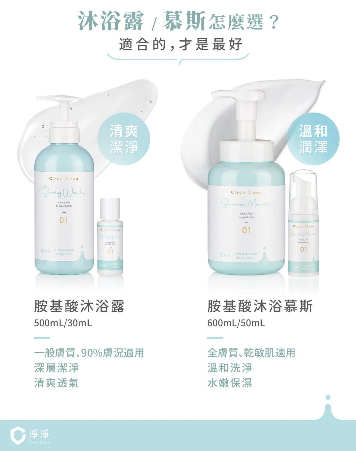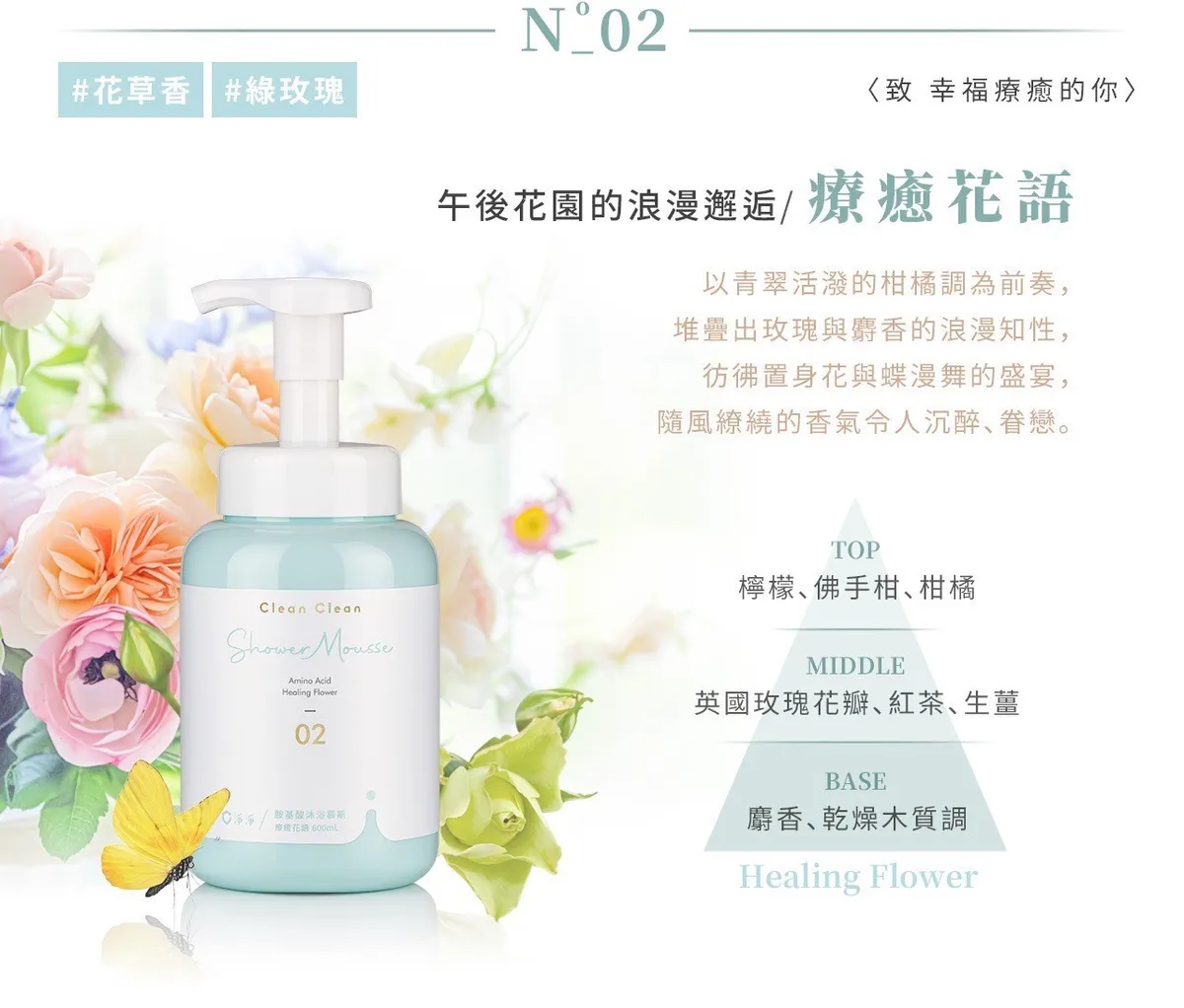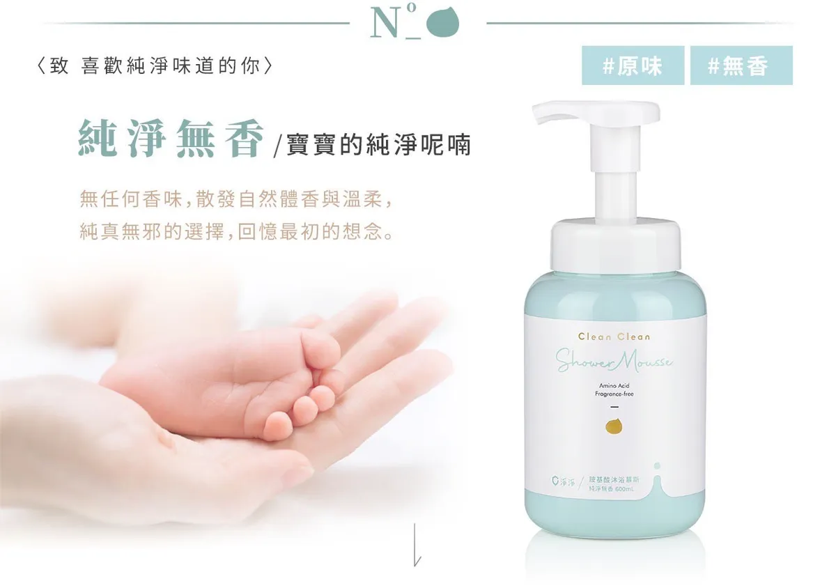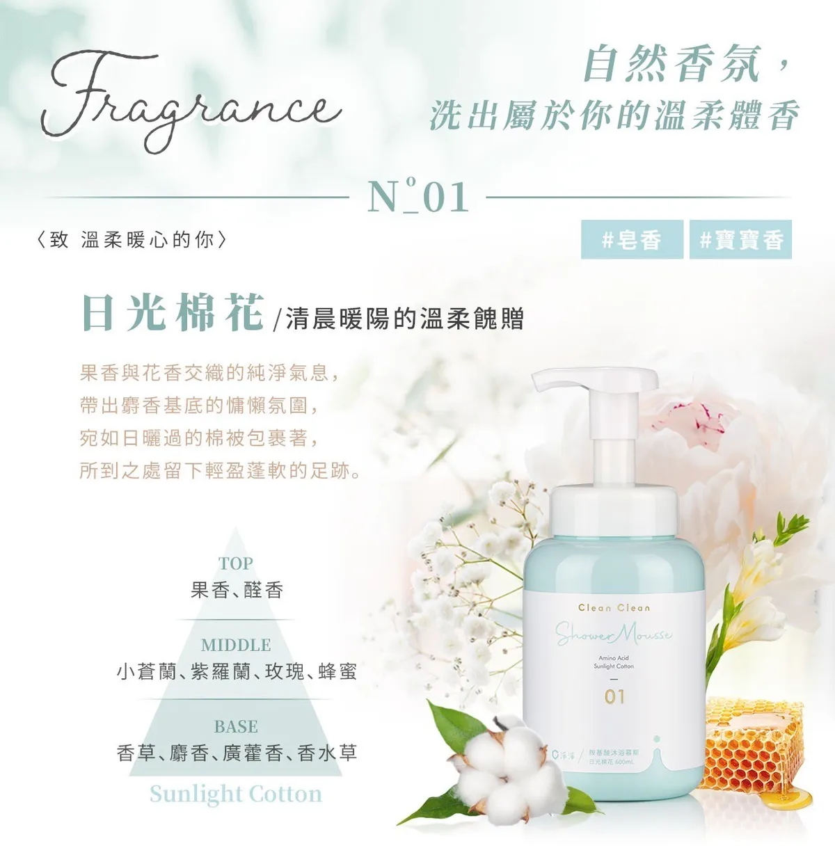 [商品特色] 全胺基酸配方:給肌膚剛好的潔凈,洗後不乾澀、假滑親膚抗菌:衛福部核可抗菌成份『繖花醇』洗感再升級:維生素B5、海藻糖、金縷梅萃取維持肌膚最佳油水平衡,舒緩肌膚不適慕斯設計:綿密泡沫,好沖洗不殘留無皂鹼、SLS/SLES等爭議成分、使用更安心【適用膚質】:一般膚質、乾肌、敏弱肌、中性肌【香調:日光棉花】:完美融合小蒼蘭、玫瑰、蜂蜜、廣藿香,彷彿沐浴在暖陽之下,舒緩又放鬆,給予絕佳的沐浴體驗【香調:療癒花語】:玫瑰、佛手柑與乾燥木質調香氛的完美融合,彷彿漫步在花園中~【香調:純淨無香】:無添加香氛成分