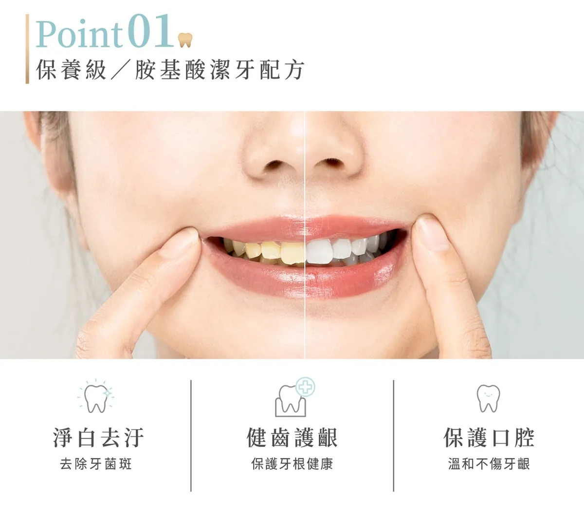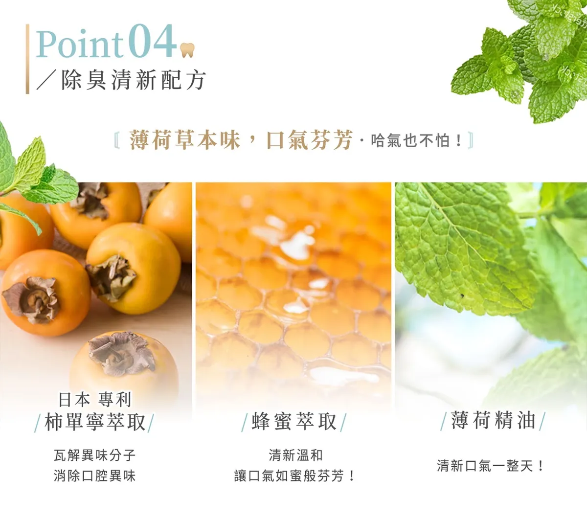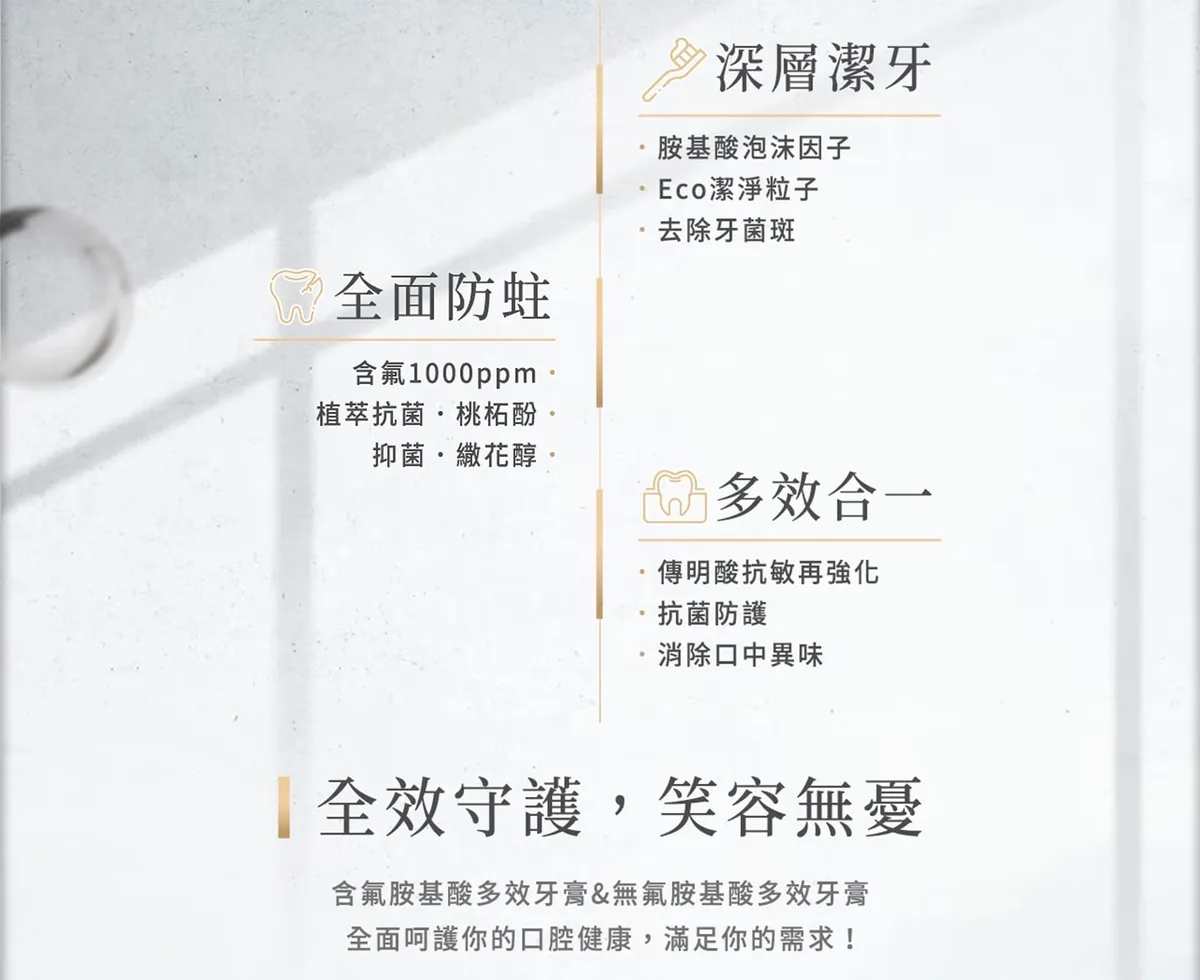 [含氟牙膏 - 商品特色] 淨白、抗敏、防蛀、護齦多效合一成人牙膏胺基酸起泡劑:低泡好沖洗、減少口腔摩擦全面防蛀再升級:桃拓酚+繖花醇、減少細菌、牙菌膜滋生保養級護齦抗敏配方:傳明酸+檸檬酸鉀、減少牙齦出血問題清新除臭配方:柿單寧+蜂蜜+薄荷精油、維持好口氣、哈氣也不怕含氟1000ppm*配合正確刷牙習慣 [無氟牙膏 - 商品特色] 淨白、抗敏、防蛀、護齦多效合一成人「無氟」牙膏不含氟配方,適合口腔敏感者使用胺基酸起泡劑:低泡好沖洗、減少口腔摩擦全面防蛀再升級:桃拓酚+繖花醇、減少細菌、牙菌膜滋生保養級護齦抗敏配方:傳明酸+檸檬酸鉀、減少牙齦出血問題清新除臭配方:柿單寧+蜂蜜+薄荷精油、維持好口氣、哈氣也不怕*配合正確刷牙習慣
