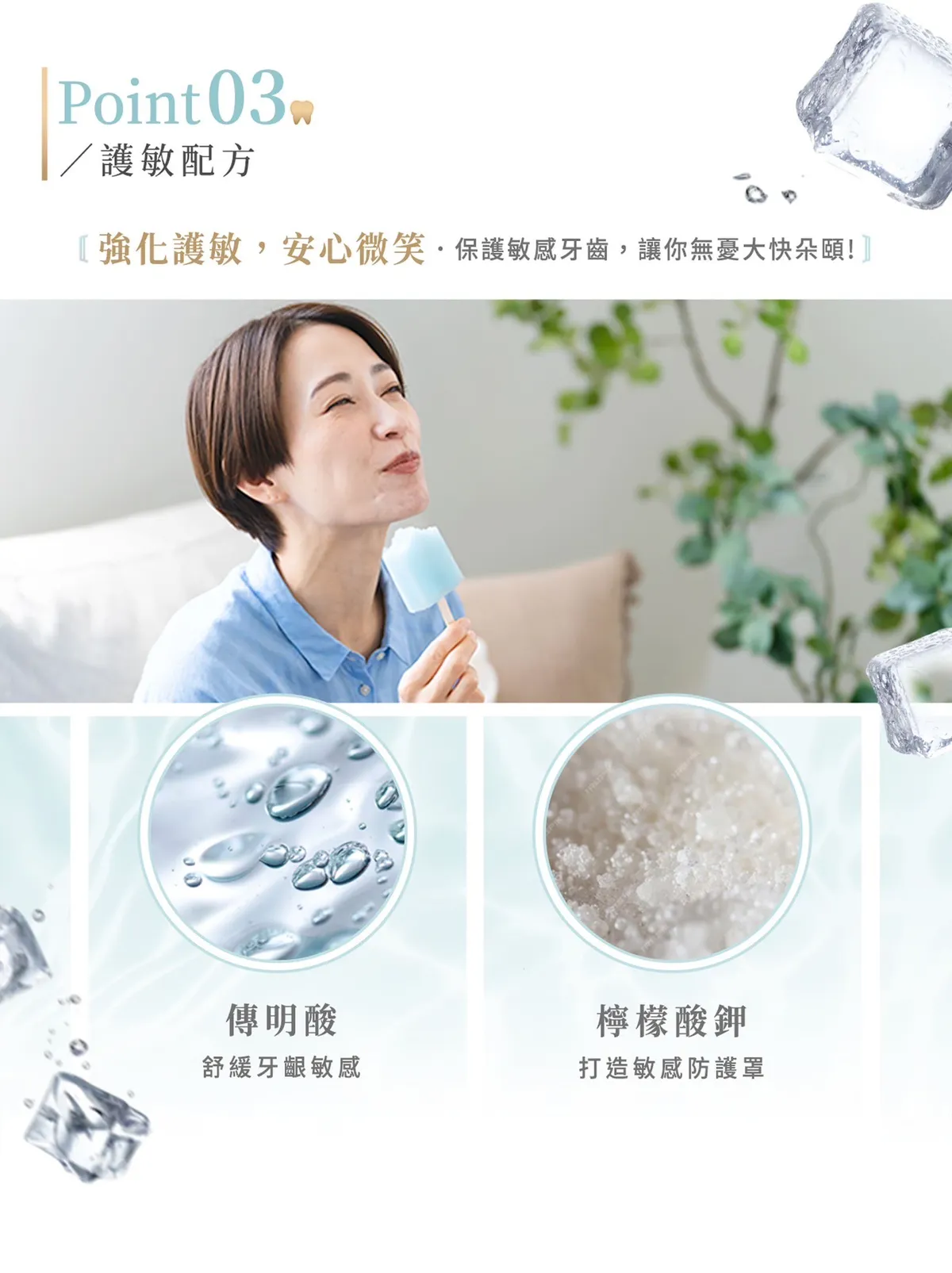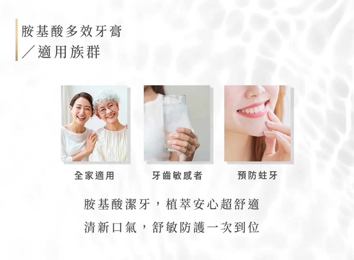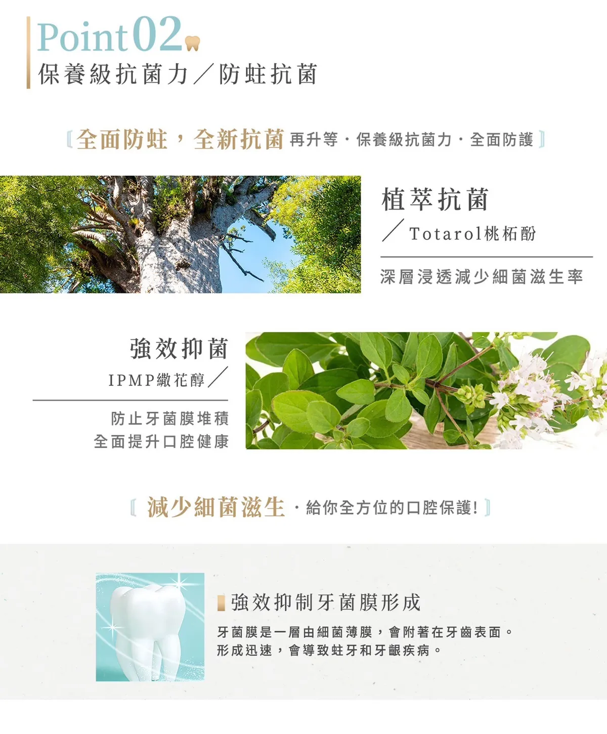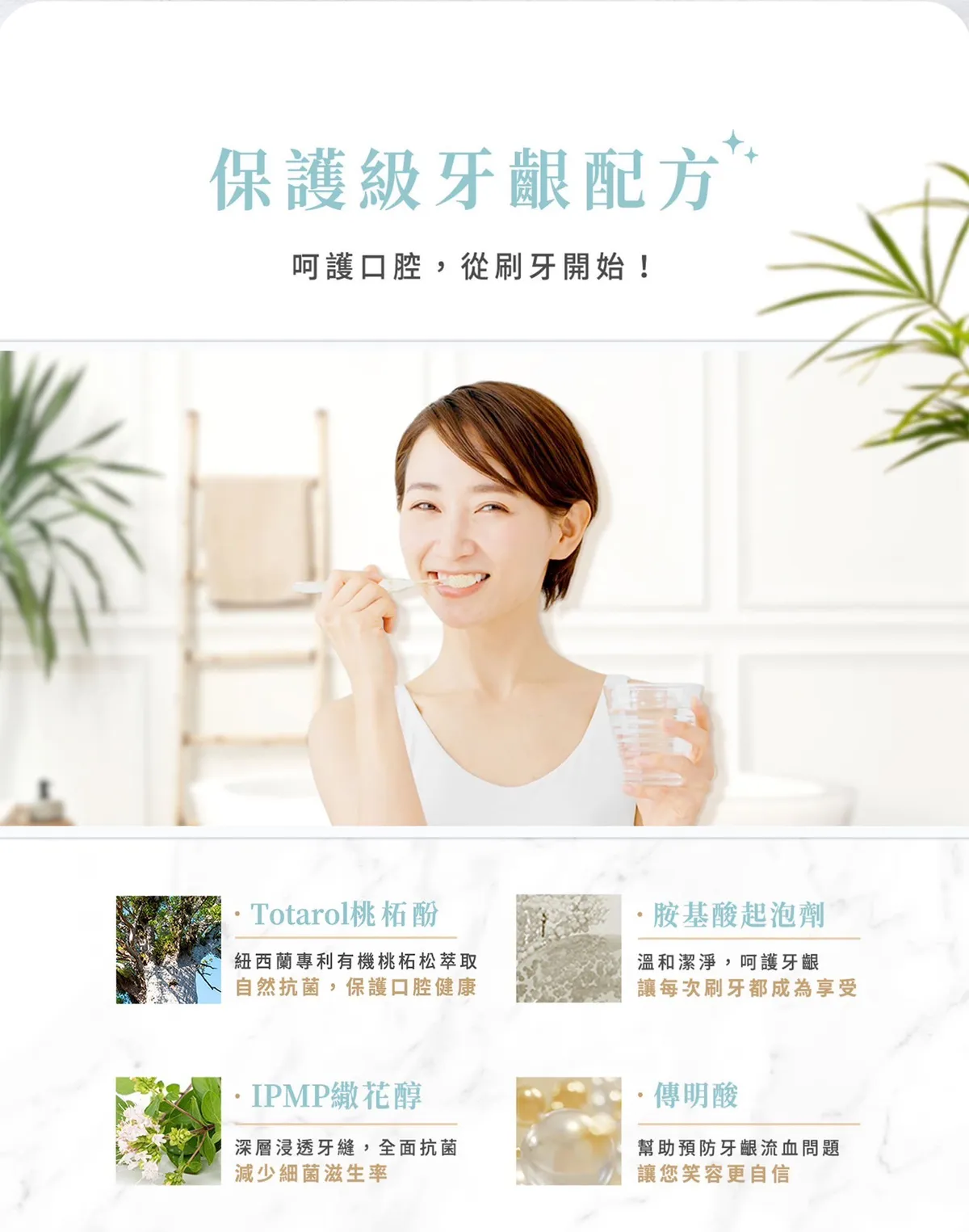 [含氟牙膏 - 商品特色] 淨白、抗敏、防蛀、護齦多效合一成人牙膏胺基酸起泡劑:低泡好沖洗、減少口腔摩擦全面防蛀再升級:桃拓酚+繖花醇、減少細菌、牙菌膜滋生保養級護齦抗敏配方:傳明酸+檸檬酸鉀、減少牙齦出血問題清新除臭配方:柿單寧+蜂蜜+薄荷精油、維持好口氣、哈氣也不怕含氟1000ppm*配合正確刷牙習慣 [無氟牙膏 - 商品特色] 淨白、抗敏、防蛀、護齦多效合一成人「無氟」牙膏不含氟配方,適合口腔敏感者使用胺基酸起泡劑:低泡好沖洗、減少口腔摩擦全面防蛀再升級:桃拓酚+繖花醇、減少細菌、牙菌膜滋生保養級護齦抗敏配方:傳明酸+檸檬酸鉀、減少牙齦出血問題清新除臭配方:柿單寧+蜂蜜+薄荷精油、維持好口氣、哈氣也不怕*配合正確刷牙習慣