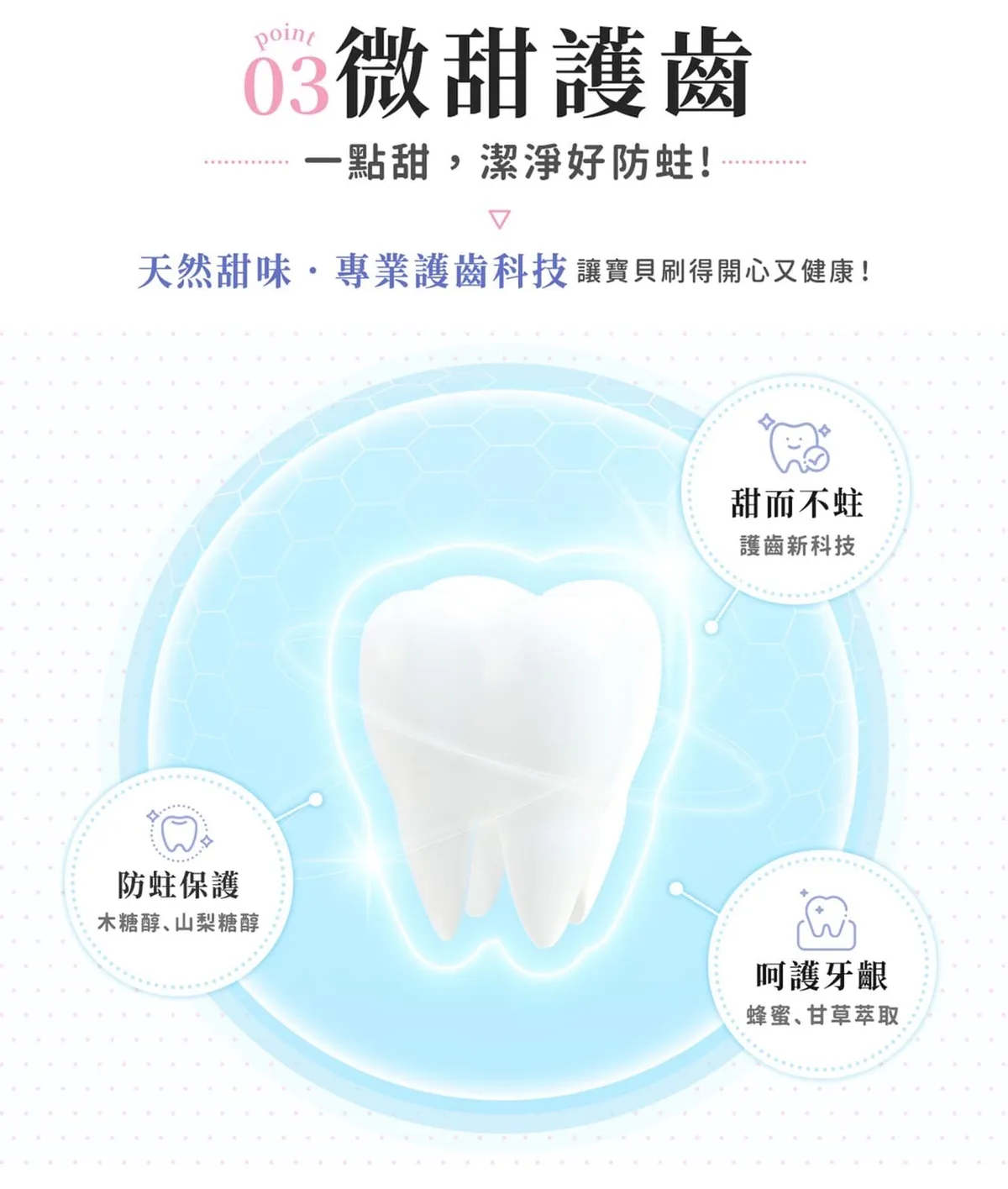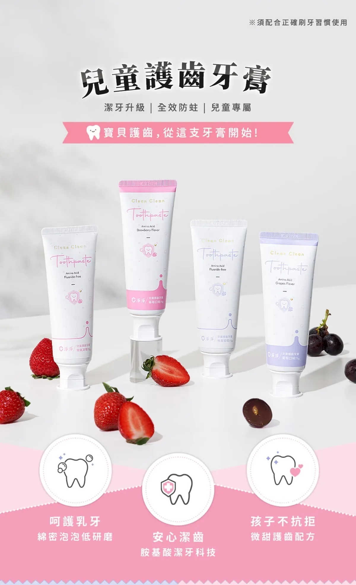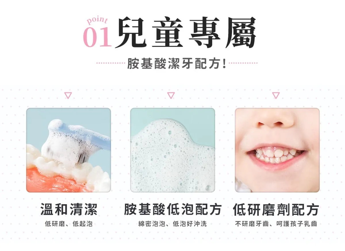 [商品特色] 胺基酸泡沫,呵護牙齦、減少牙周病機率含氟1000ppm,有效預防蛀牙。0薄荷、不辣口,讓寶貝愛上刷牙人氣口味:草莓、葡萄任你選*需搭配正常刷牙習慣 [銷售重點] 胺基酸低泡配方,溫和潔牙、不傷乳牙。含氟1000ppm,有效預防蛀牙。香香果味、微甜護齒,刷牙不再抗拒。配方升級,添加 Totarol+IPMP雙重抗菌成份,守護力更升級。