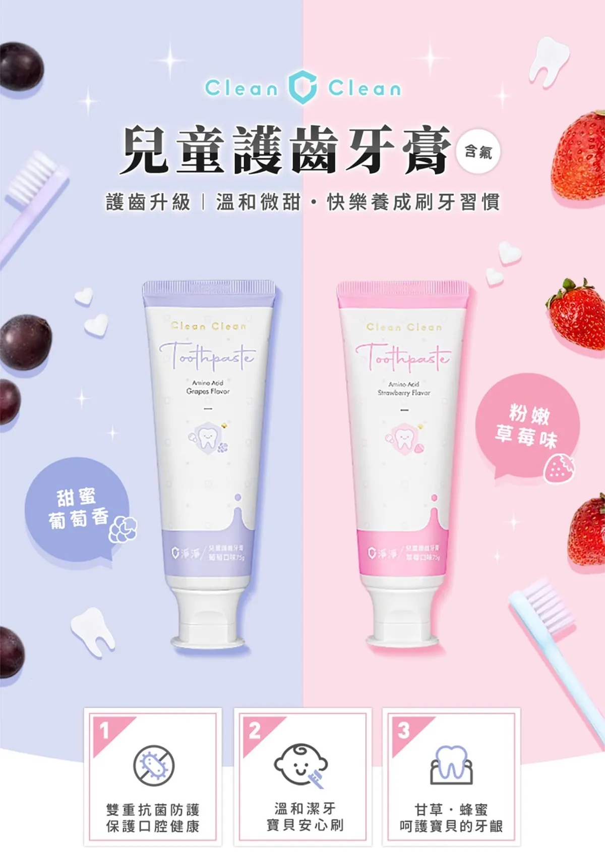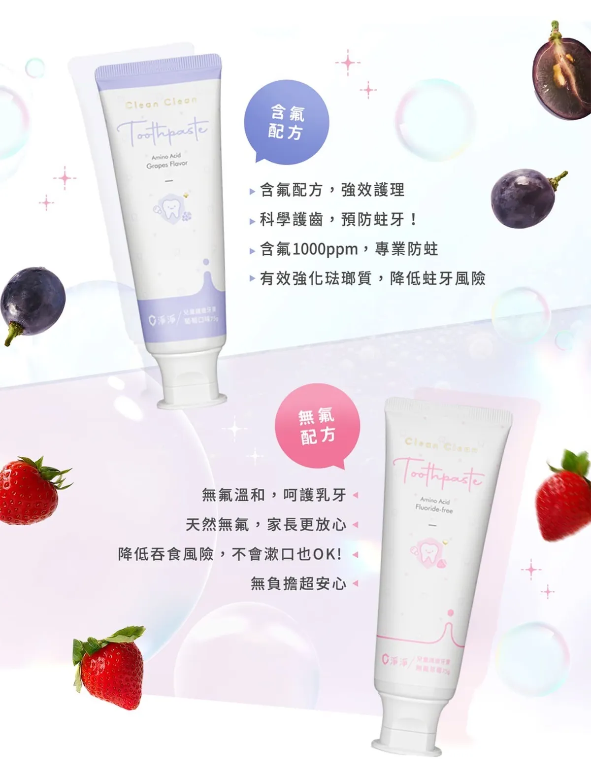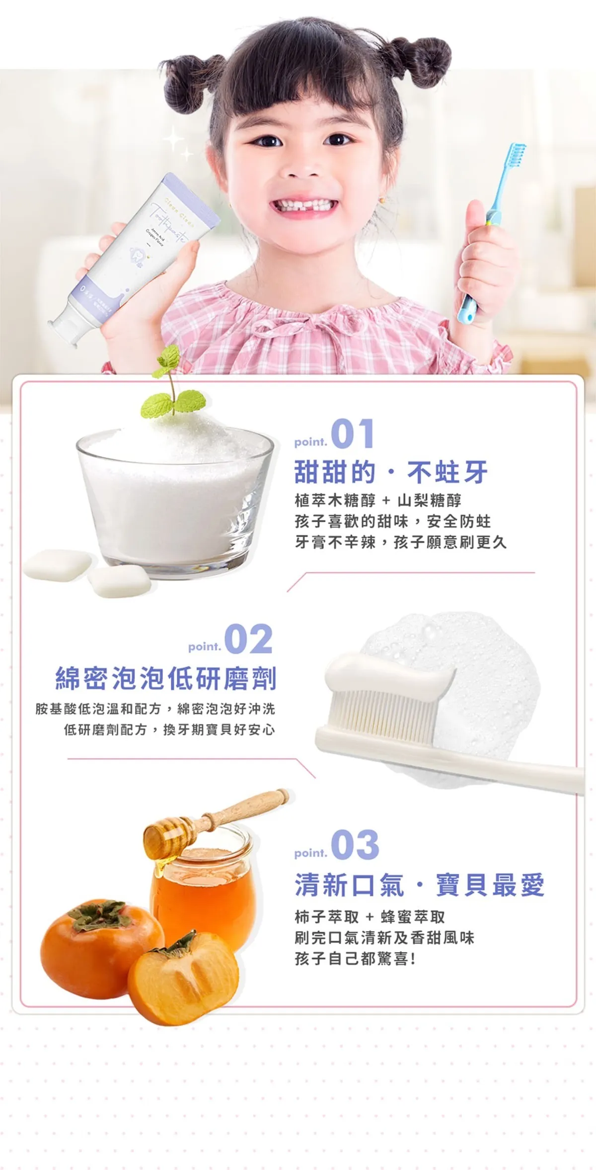 [商品特色] 胺基酸泡沫,呵護牙齦、減少牙周病機率含氟1000ppm,有效預防蛀牙。0薄荷、不辣口,讓寶貝愛上刷牙人氣口味:草莓、葡萄任你選*需搭配正常刷牙習慣 [銷售重點] 胺基酸低泡配方,溫和潔牙、不傷乳牙。含氟1000ppm,有效預防蛀牙。香香果味、微甜護齒,刷牙不再抗拒。配方升級,添加 Totarol+IPMP雙重抗菌成份,守護力更升級。